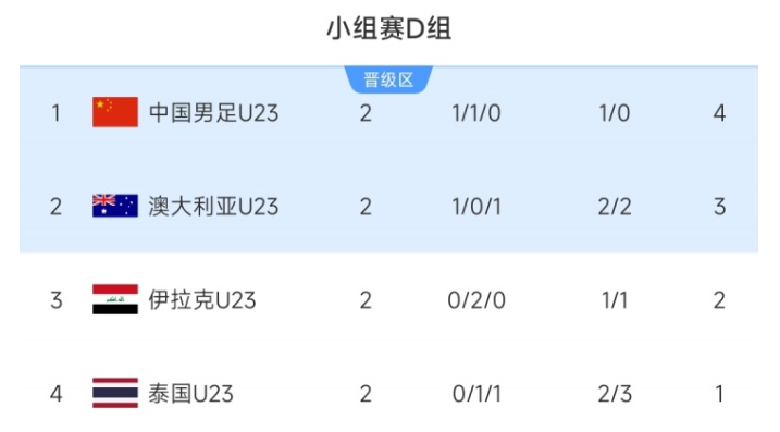 直播吧1月11日讯 U23亚洲杯小组赛D组第2轮比赛全部结束,中国U23队以1-0战胜澳大利亚U23,伊拉克U23队1-1战平泰国U23。目前小组积分榜上,中国U23队积4分暂列第一,已掌握出线主